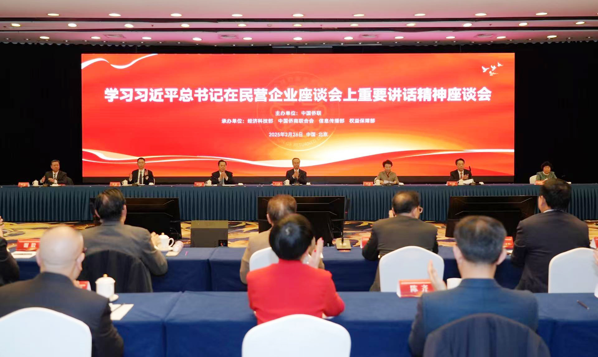 2月26日,中国侨联学习习近平总书记在民营企业座谈会上的重要讲话精神座谈会在京召开,中国侨联党组书记、主席万立骏出席并讲话,副主席程红主持会议。中国侨联党组成员、副主席程学源、连小敏,副主席高峰,及中国侨商联合会常务副会长、副会长等近60人出席。