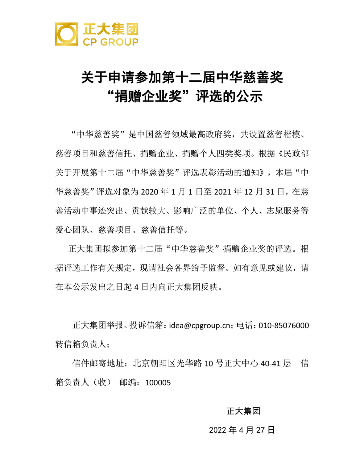 关于申请参加第十二届中华慈善奖“捐赠企业奖”评选的公示