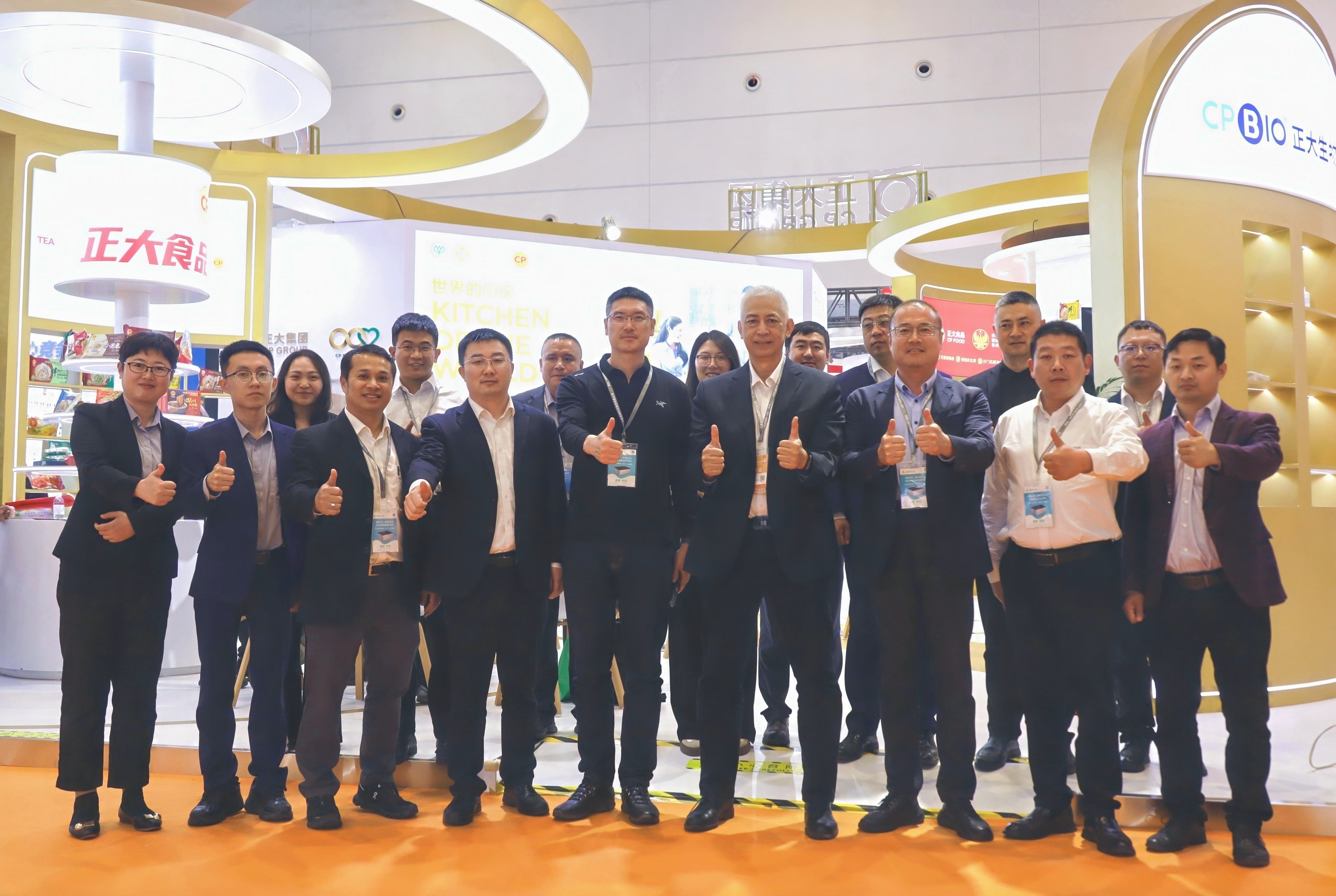 ▲正大集团农牧食品企业中国区资深副董事长薛增一(右五),正大集团农牧食品企业江苏、山东区副董事长姜波(左五)和正大展馆工作人员合影留念。