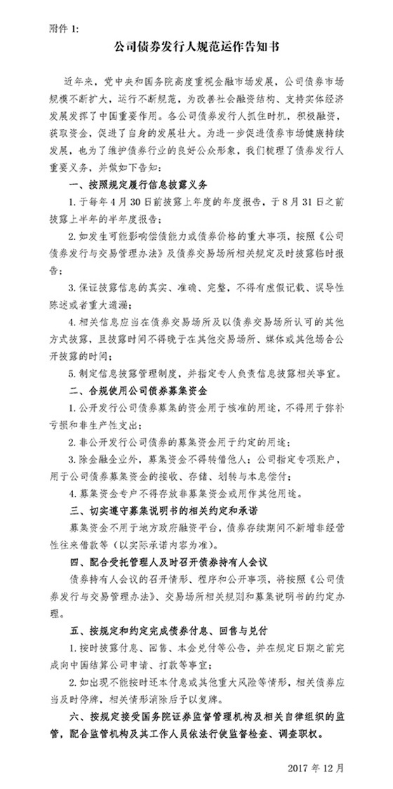 《通知》要求,各公司债券发行人应通过公司官网、微信公众号上挂《公司债券发行人规范运作告知书》。