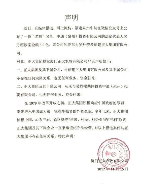 近日,有媒体报道、网上流传,福建泉州中院在微信公众号上公布了一份“老赖”名单,中通(泉州)投资有限公司的法定代表人吴丹樱涉案金额5.5亿,该公司的股东为吴丹樱及福建正大集团有限公司。对此厦门正大农牧有限公司发布声明,内容如下: