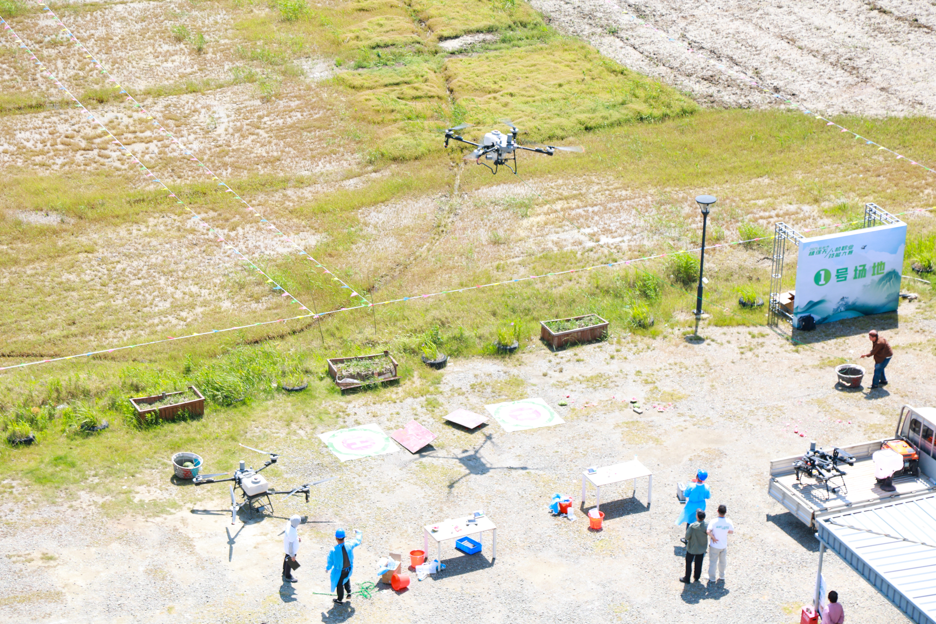 此次比赛主要考察模拟药剂配置、手动飞防操作以及定点运输等。这群无人机飞手中既有来自开展植保无人机飞防的社会化服务组织的职业飞手,也有热衷于“机械换人”的新农人代表。比赛现场,一架架无人机在飞手的操控下呼啸而起,穿梭在农田的上空,精准完成施药、避障等任务,展现出了高超的技术水平。