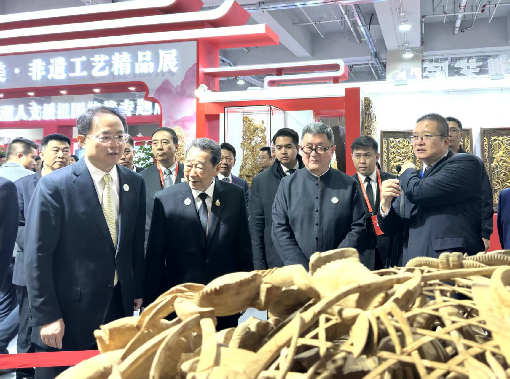 ▲潮州市委书记何晓军(前排左一)陪同谢国民集团资深董事长(前排左二)参观“潮工至美——广东(潮州)非遗工艺精品展”,李闻海副总裁(前排左三)等陪同参观。