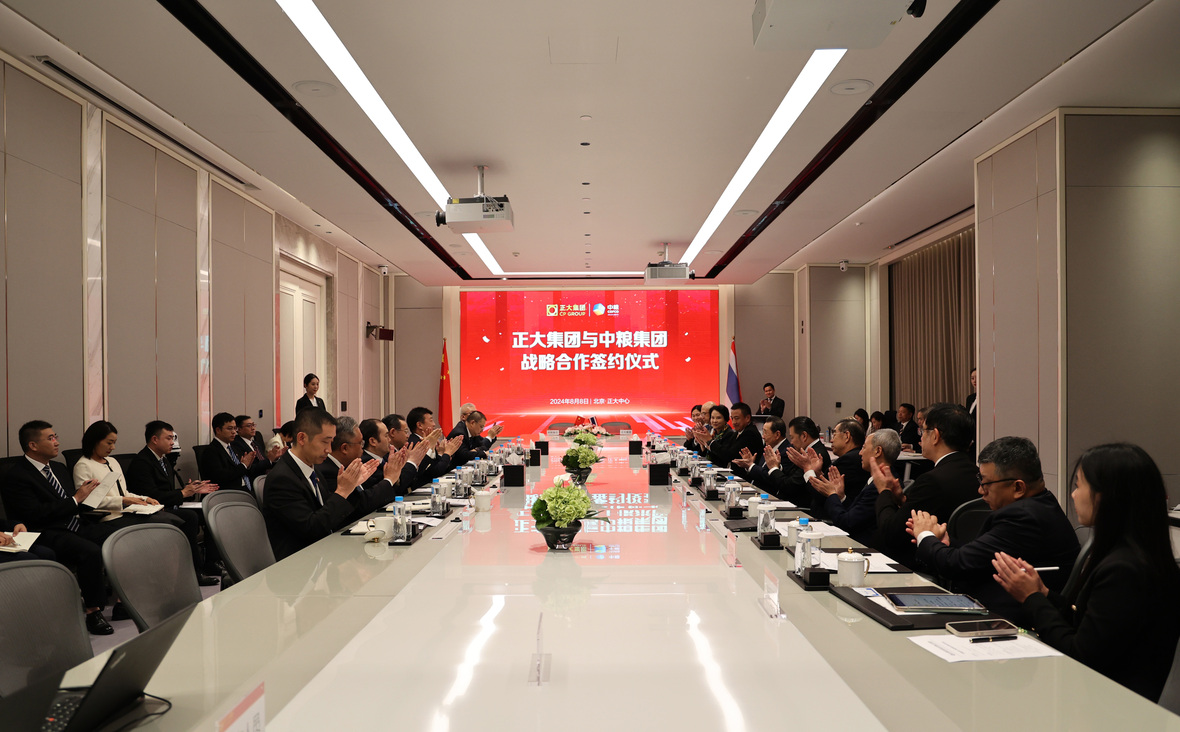 8月8日,正大集团与中粮集团在正大集团中国区总部北京正大中心签署战略合作协议。正大集团资深董事长谢国民、董事长谢吉人,中粮集团党组书记、董事长吕军,党组副书记、总经理栾日成等出席签约仪式。