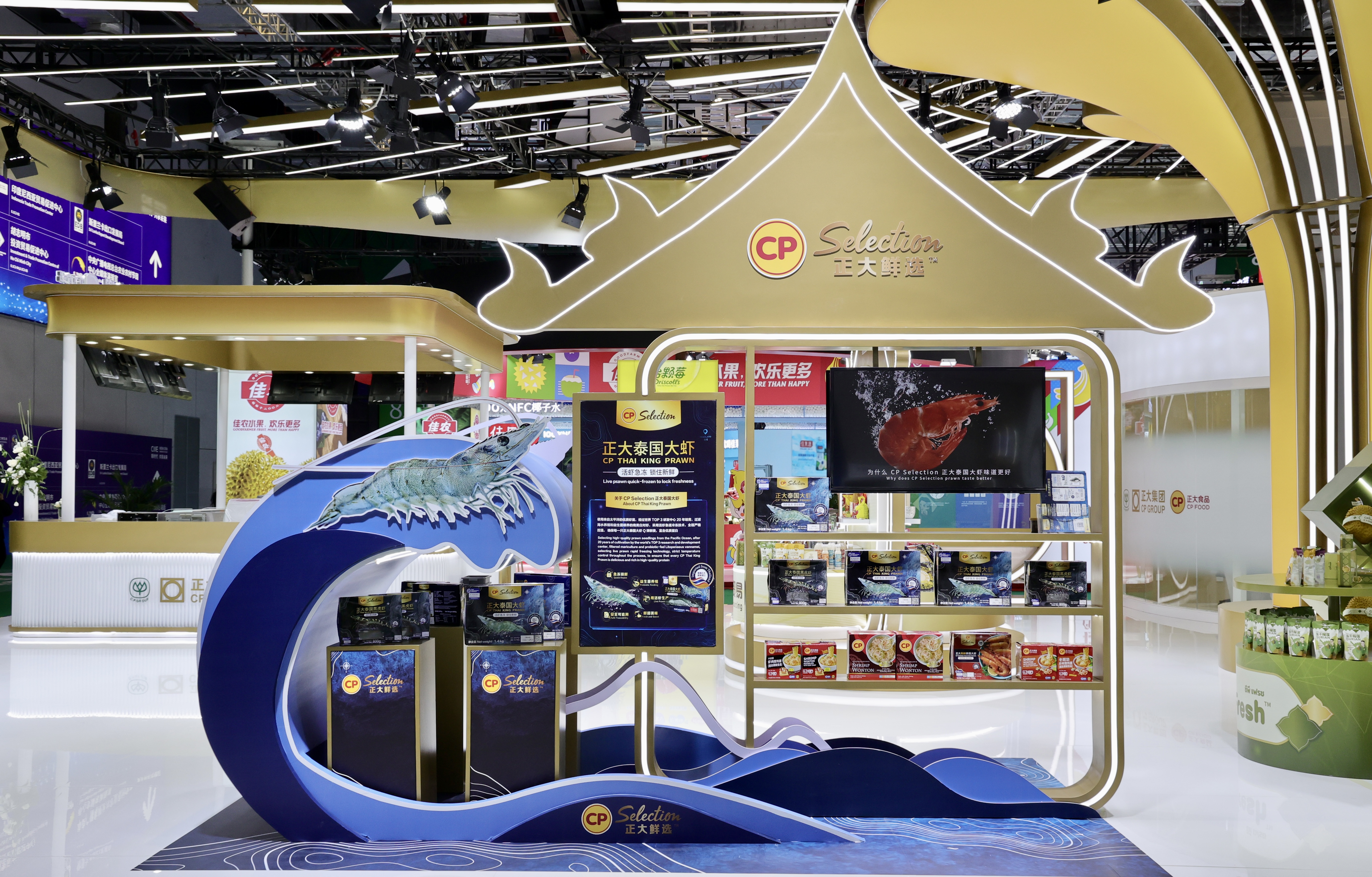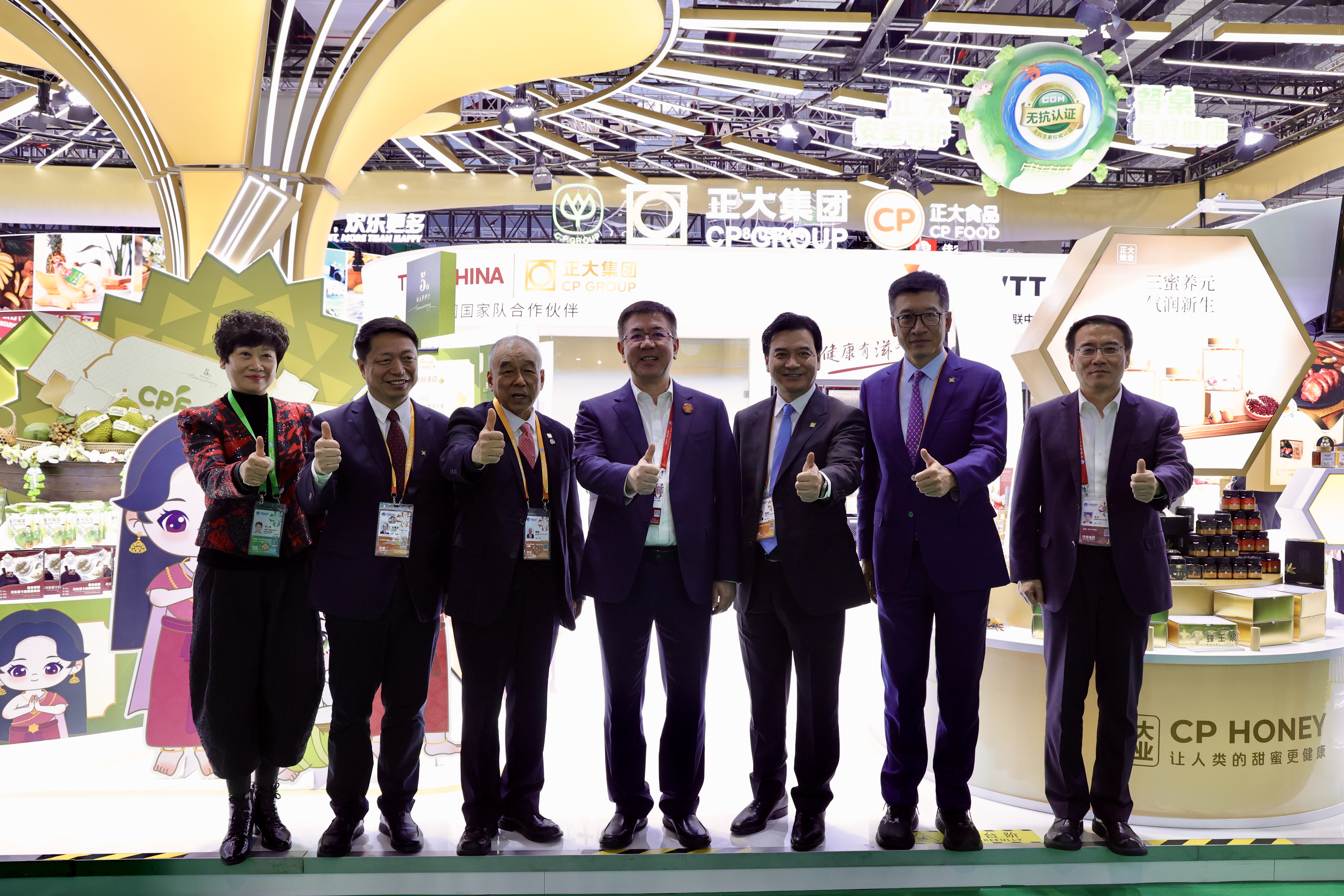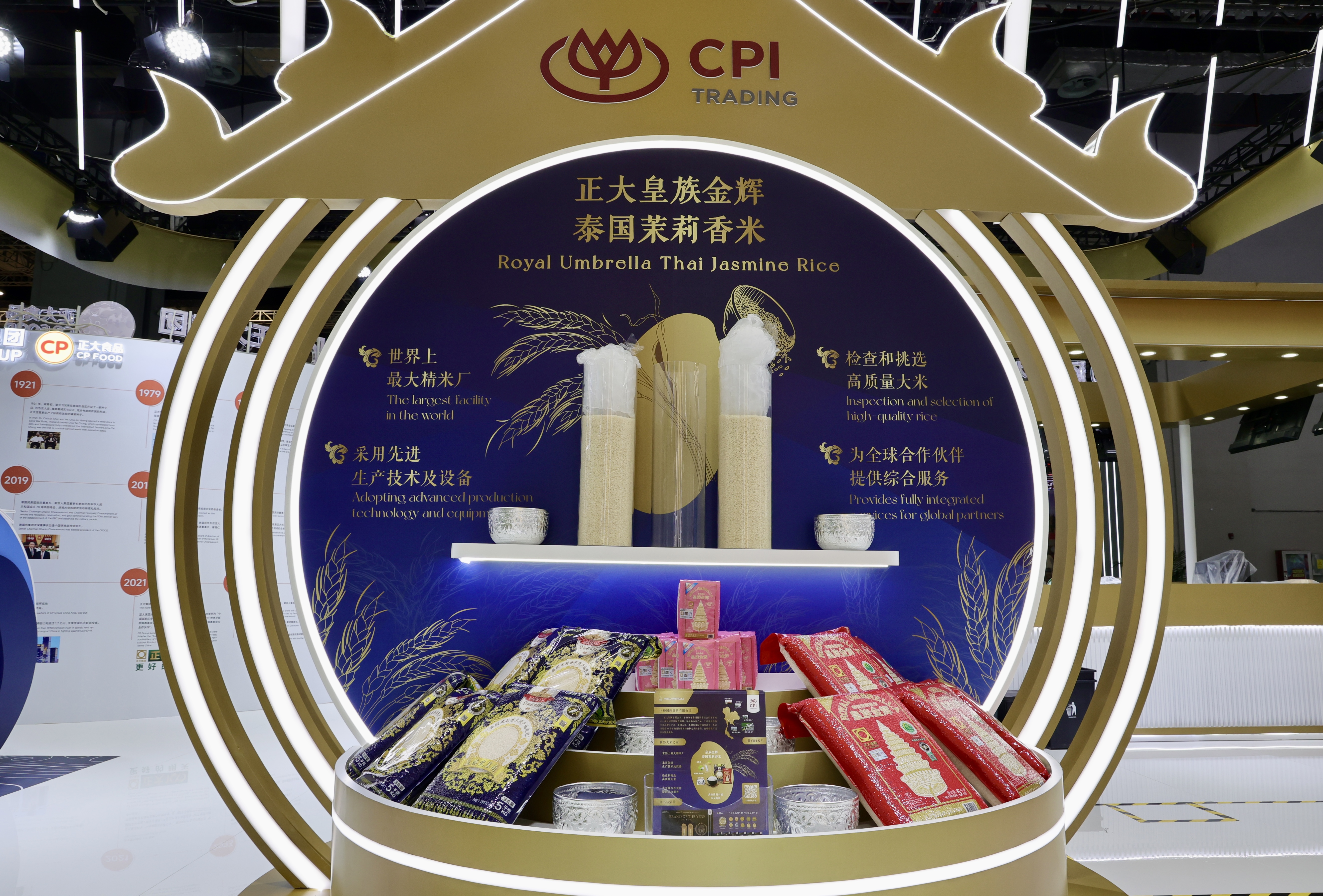 本届进博会上,正大集团组织20个业务板块参展,共231款产品,涵盖了正大泰国大虾、CP Fresh泰国水果、酱料产品、泰国大米、预包装食品、主食类、油炸小食、水产、香肠、鸡蛋、猪肉、鸡肉、榴莲制品、鳄鱼产品、水饮、休闲零食、蜂蜜、红酒、茶叶等。