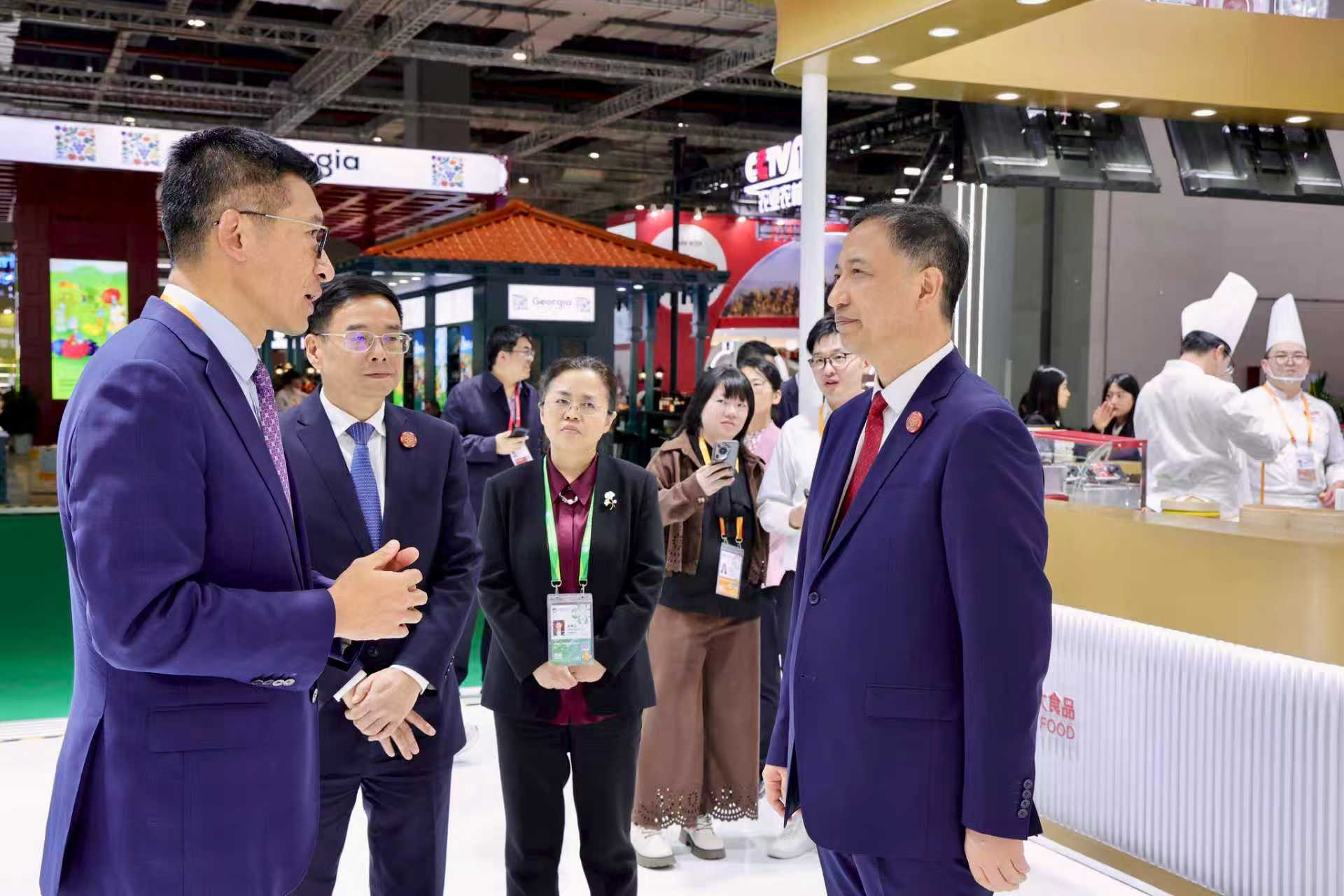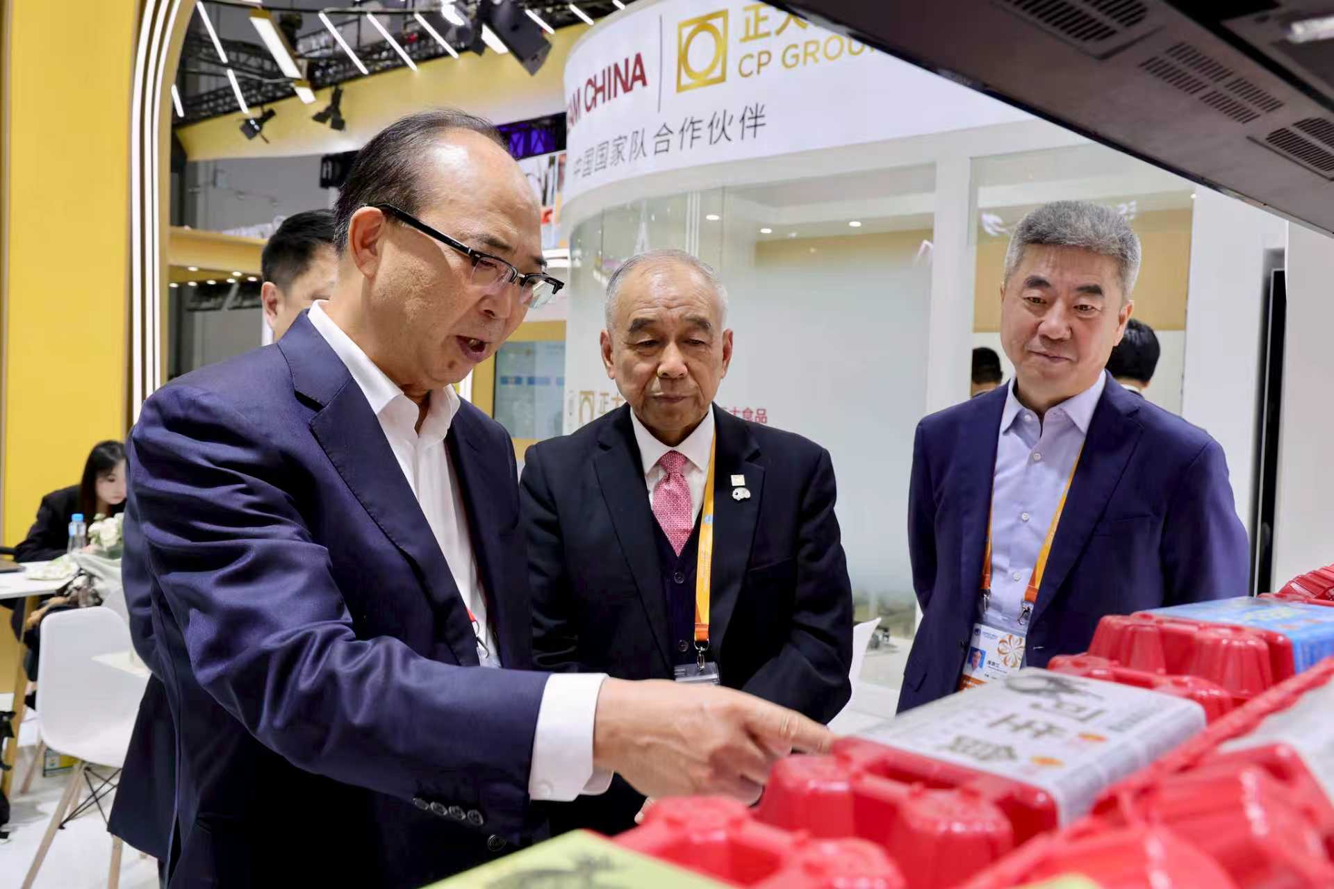 ▲11月5日,益海嘉里金龙鱼粮油食品股份有限公司总裁穆彦魁(左一)一行参观正大展馆,薛增一资深副董事长(左二)等热情接待来宾并介绍正大鸡蛋产品。