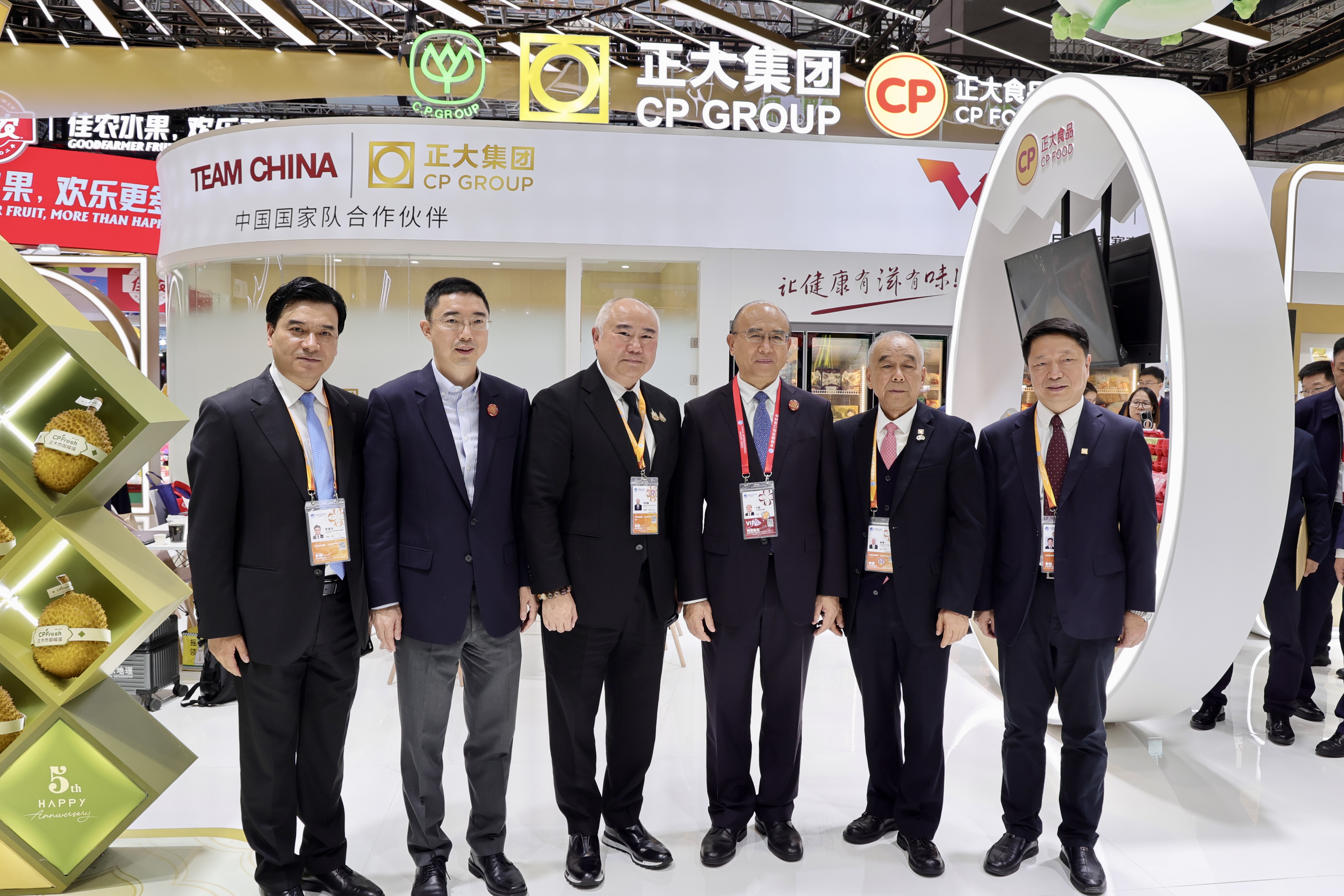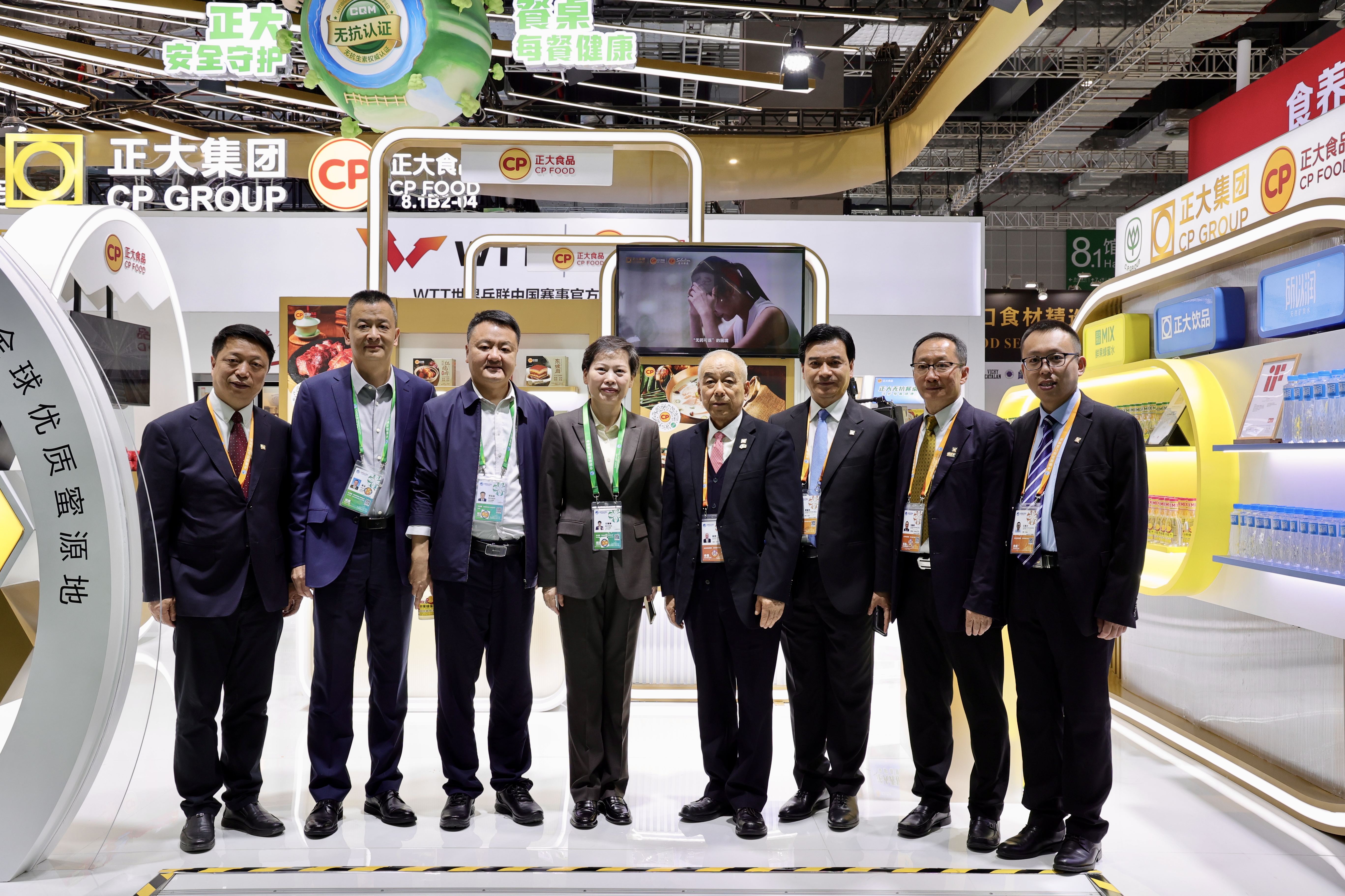 ▲11月5日,中国食品土畜进出口商会会长曹德荣(中)一行参观正大展馆,薛增一资深副董事长(右四)、曹建华资深副董事长(左四)、王富杰资深副董事长(右二)、扬纲副董事长(左二)等热情接待来宾并合影留念。
