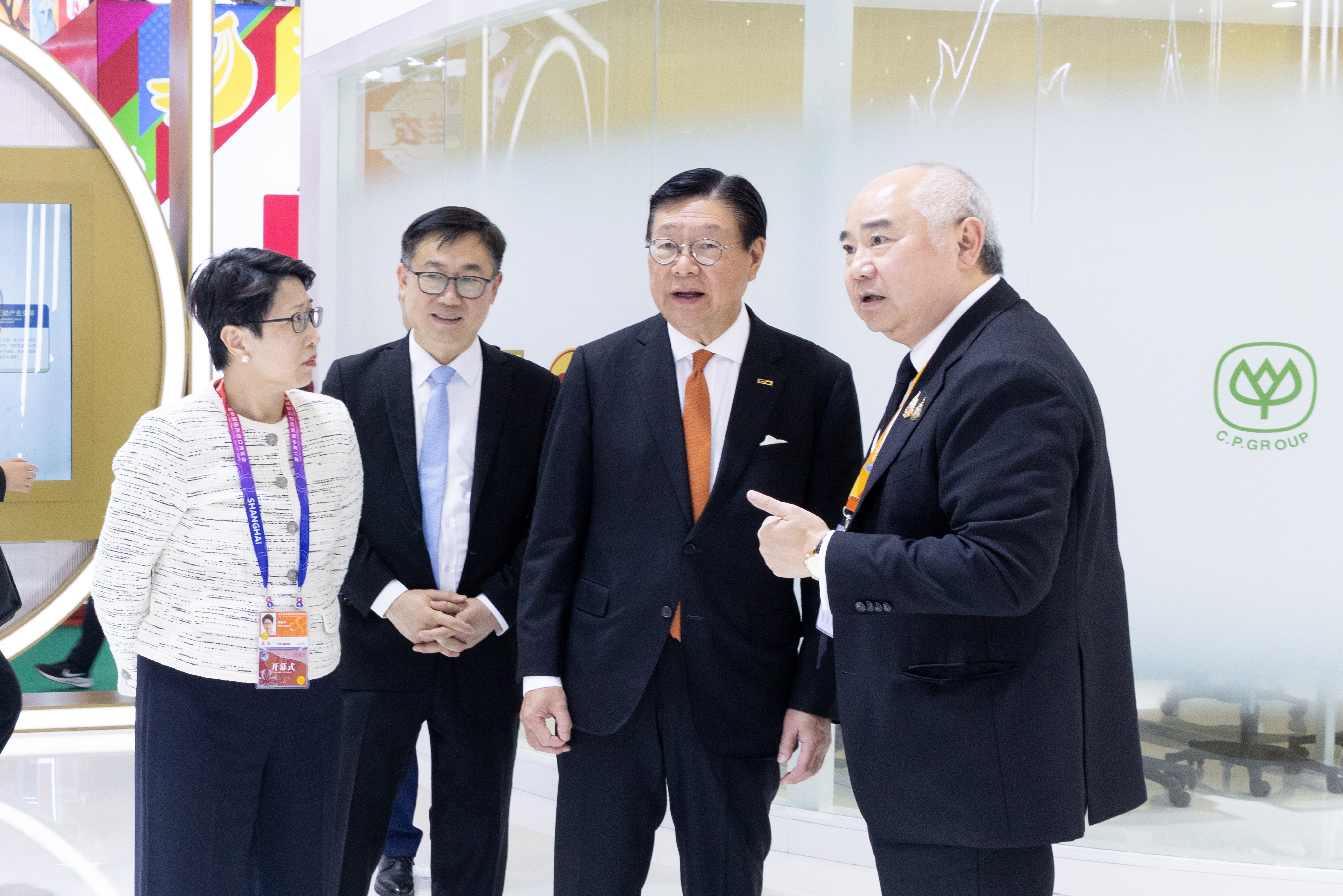 ▲11月5日,香港贸易发展局主席马时亨(右二)一行参观正大展馆,罗家顺集团资深副董事长(右一)等热情接待来宾。