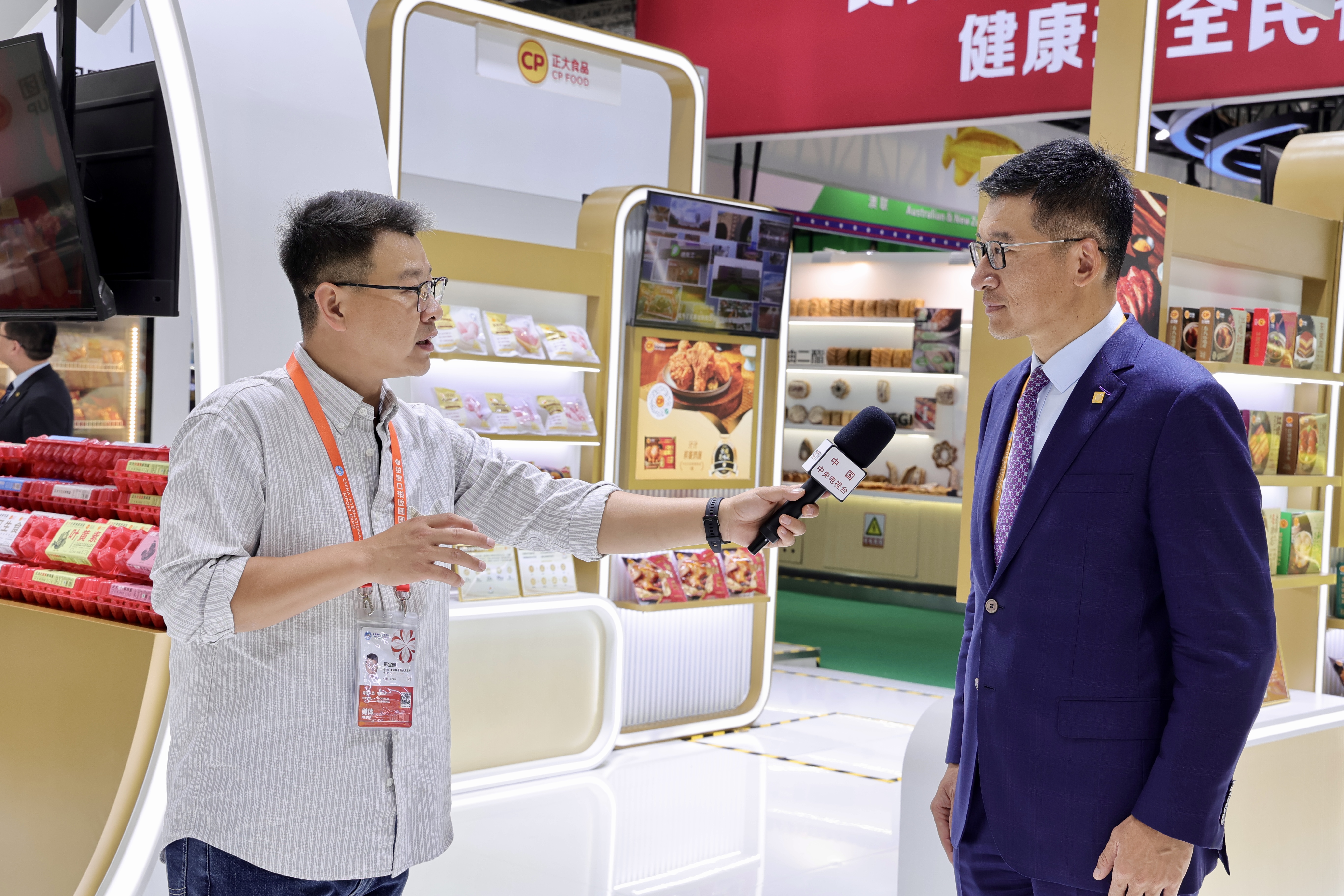 ▲11月5日,扬纲副董事长(右)在正大展馆接受央视总台记者采访。