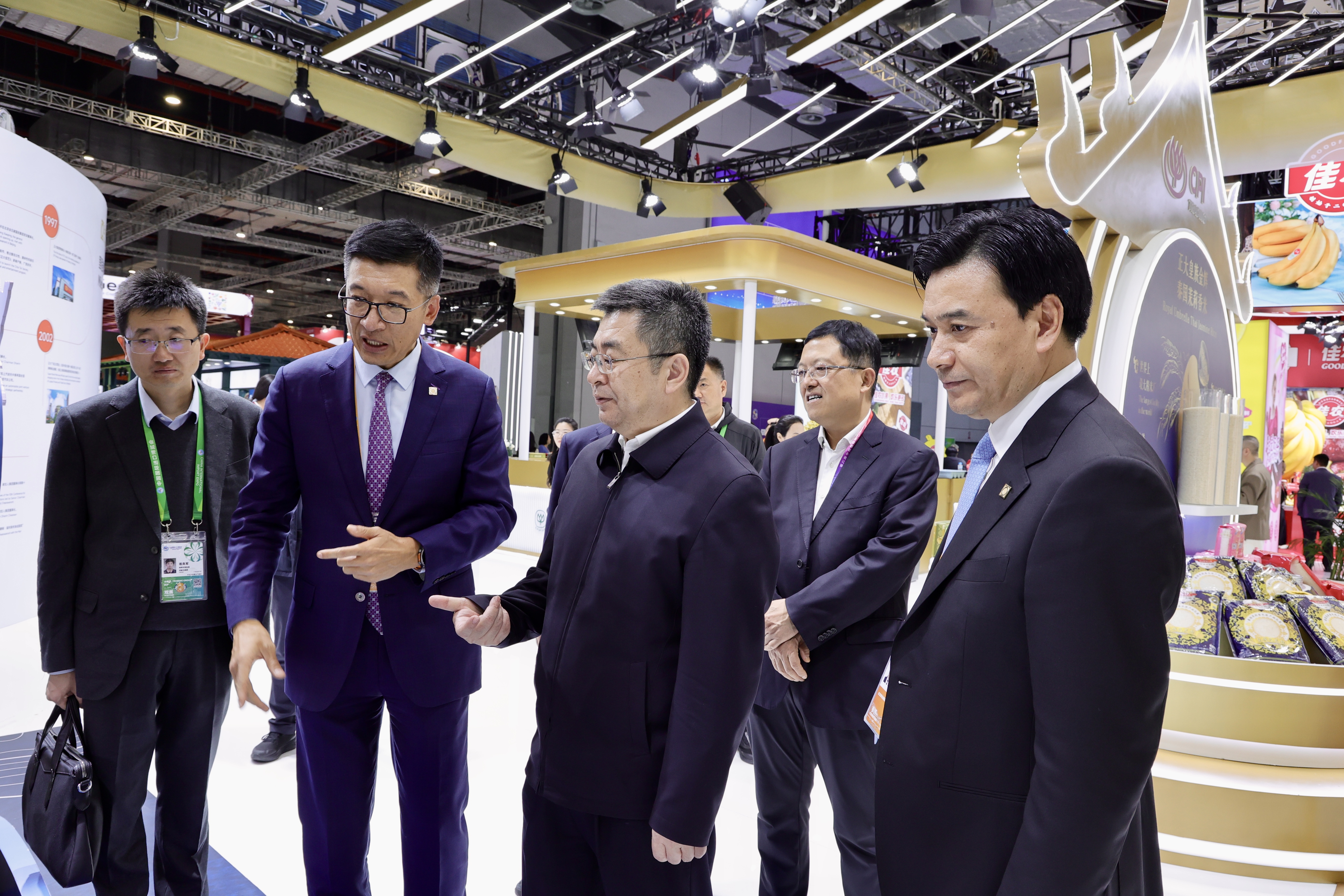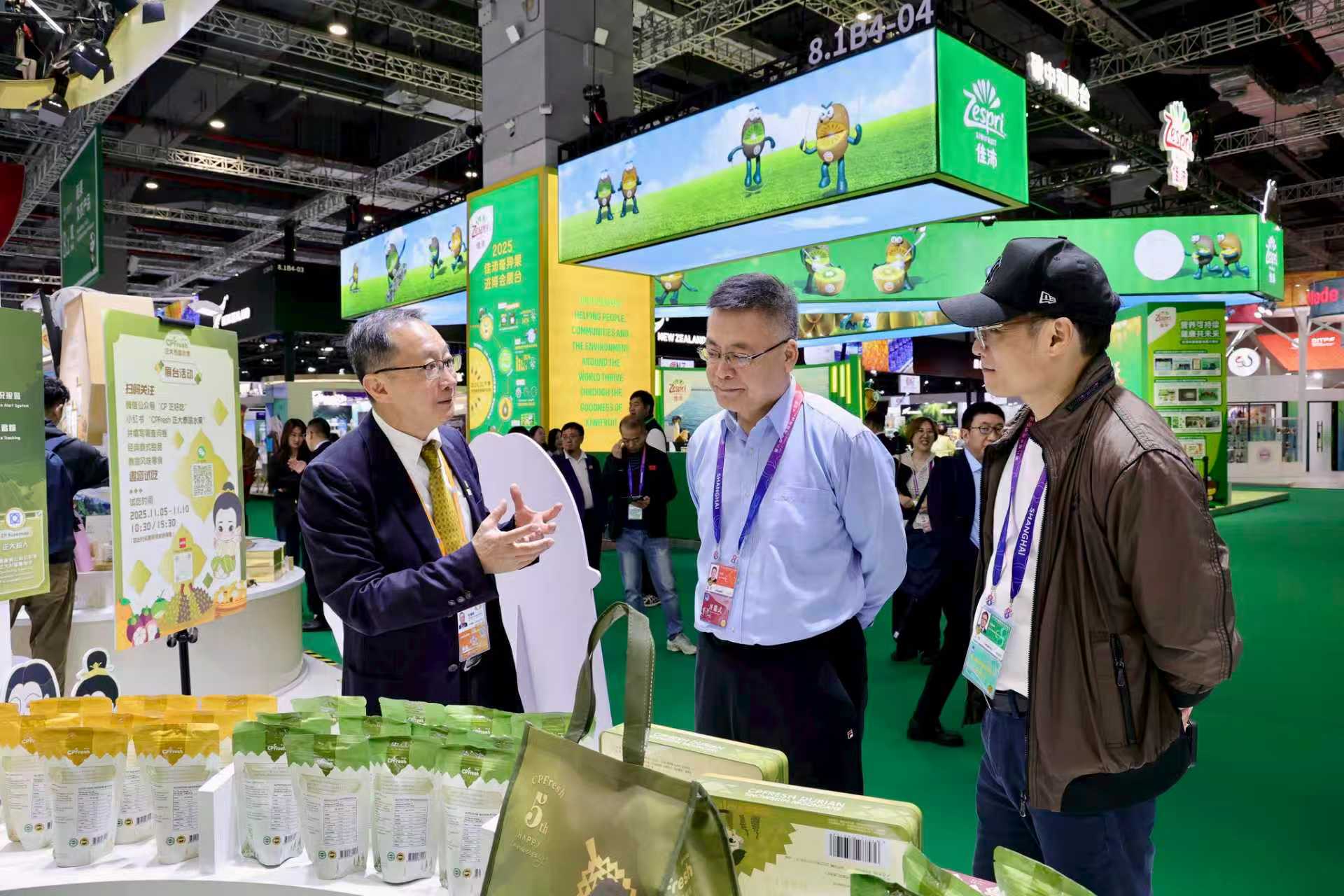 ▲11月5日,中央广播电视总台农业农村节目中心副主任王世林(中)一行参观正大展馆,张曙晖资深总裁(左)热情接待来宾并介绍CP Fresh泰国水果产品。