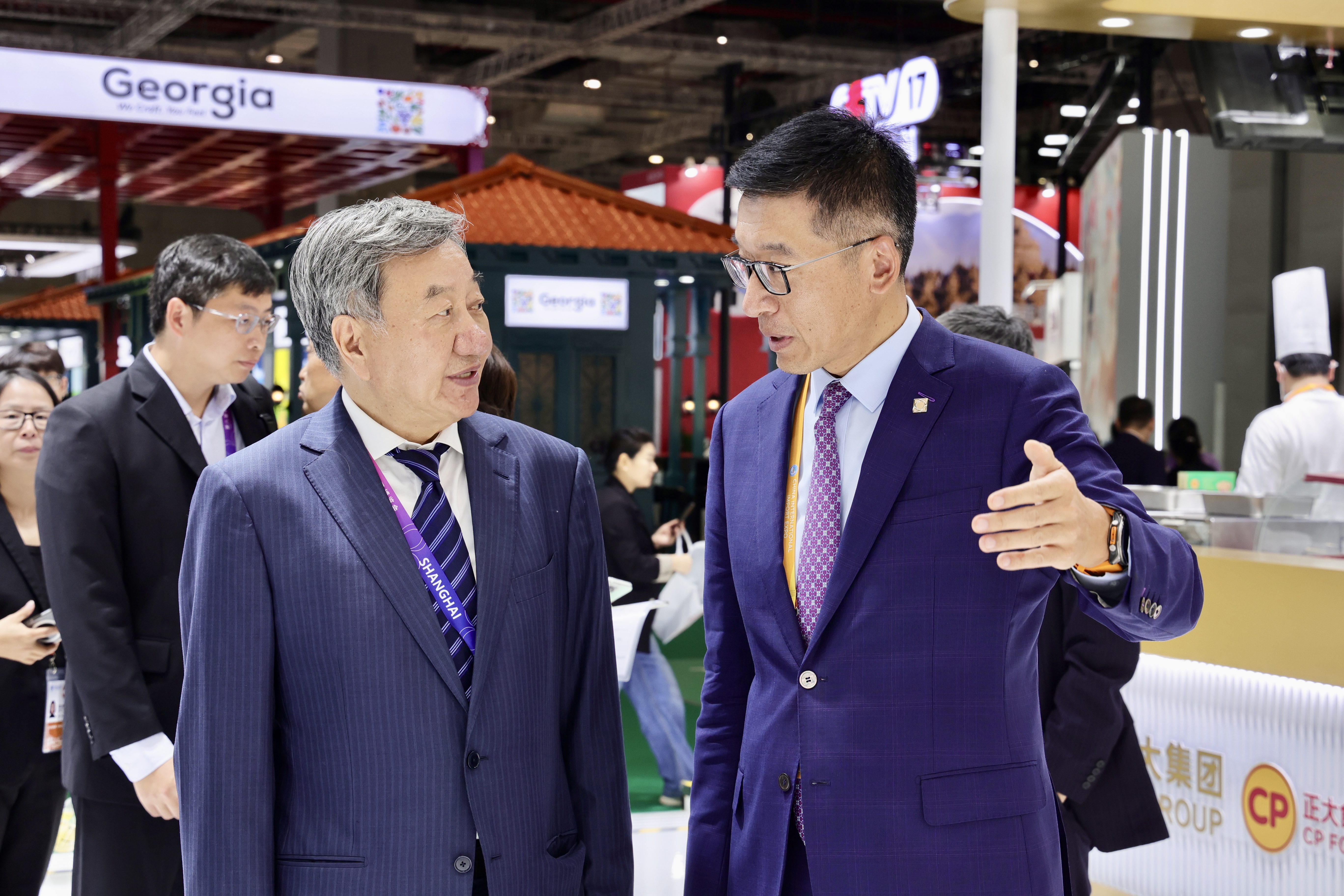 ▲11月5日,全球服务贸易联盟理事长姜增伟(左)一行参观正大展馆,扬纲副董事长(右)热情接待来宾。
