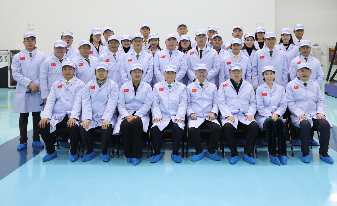 ▲谢国民集团资深董事长(前排左四)、谢吉人集团董事长(前排右三)、谢镕仁集团首席执行官(前排左二)一行参观银河航天南通卫星智慧工厂,南通市政府副市长李玲(前排左三),南通经济技术开发区党工委书记、创新区党工委副书记保德林(前排右一),银河航天创始人董事长徐鸣(前排右四)、联合创始人副总裁刘畅(前排右二)等陪同参观并合影留念。