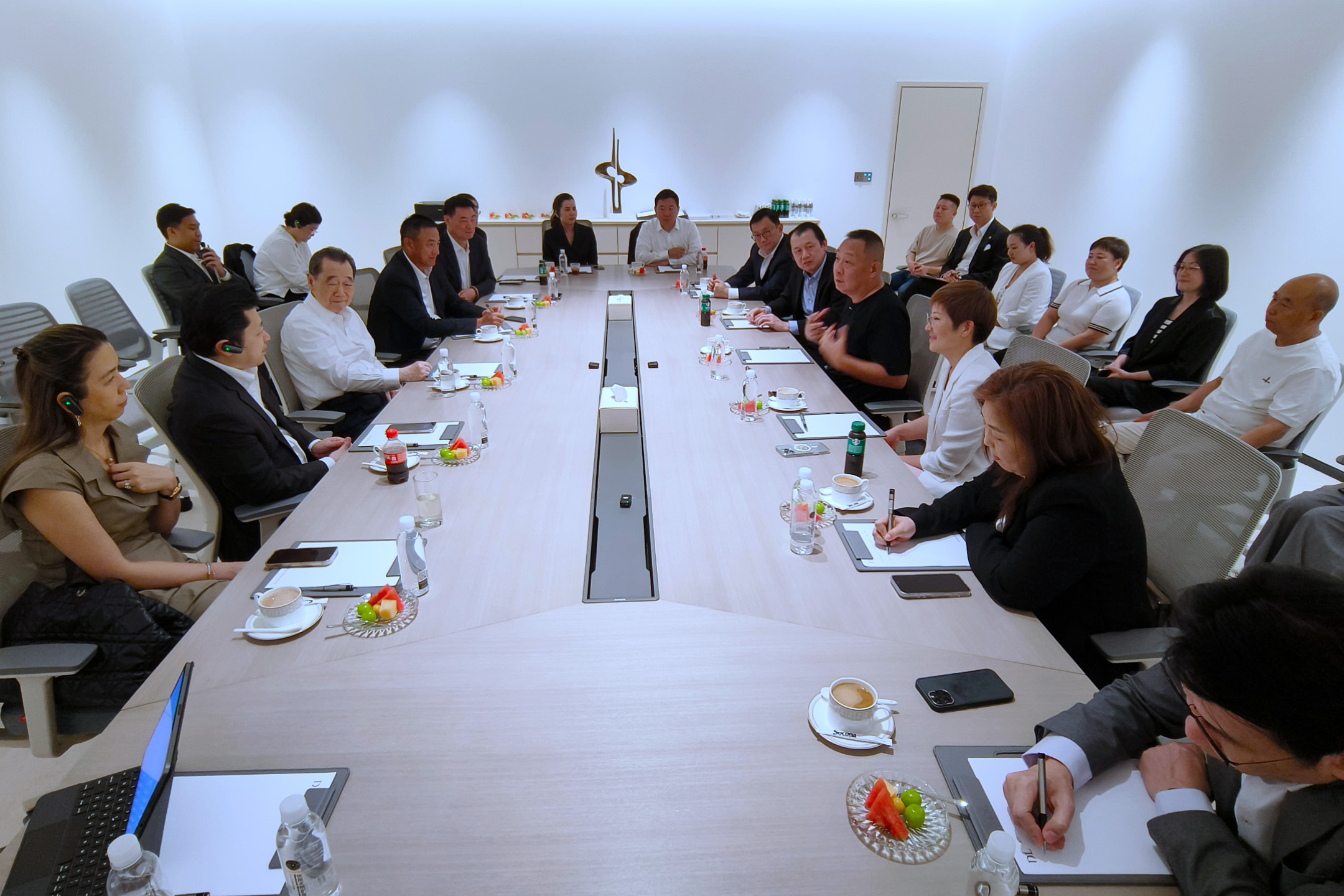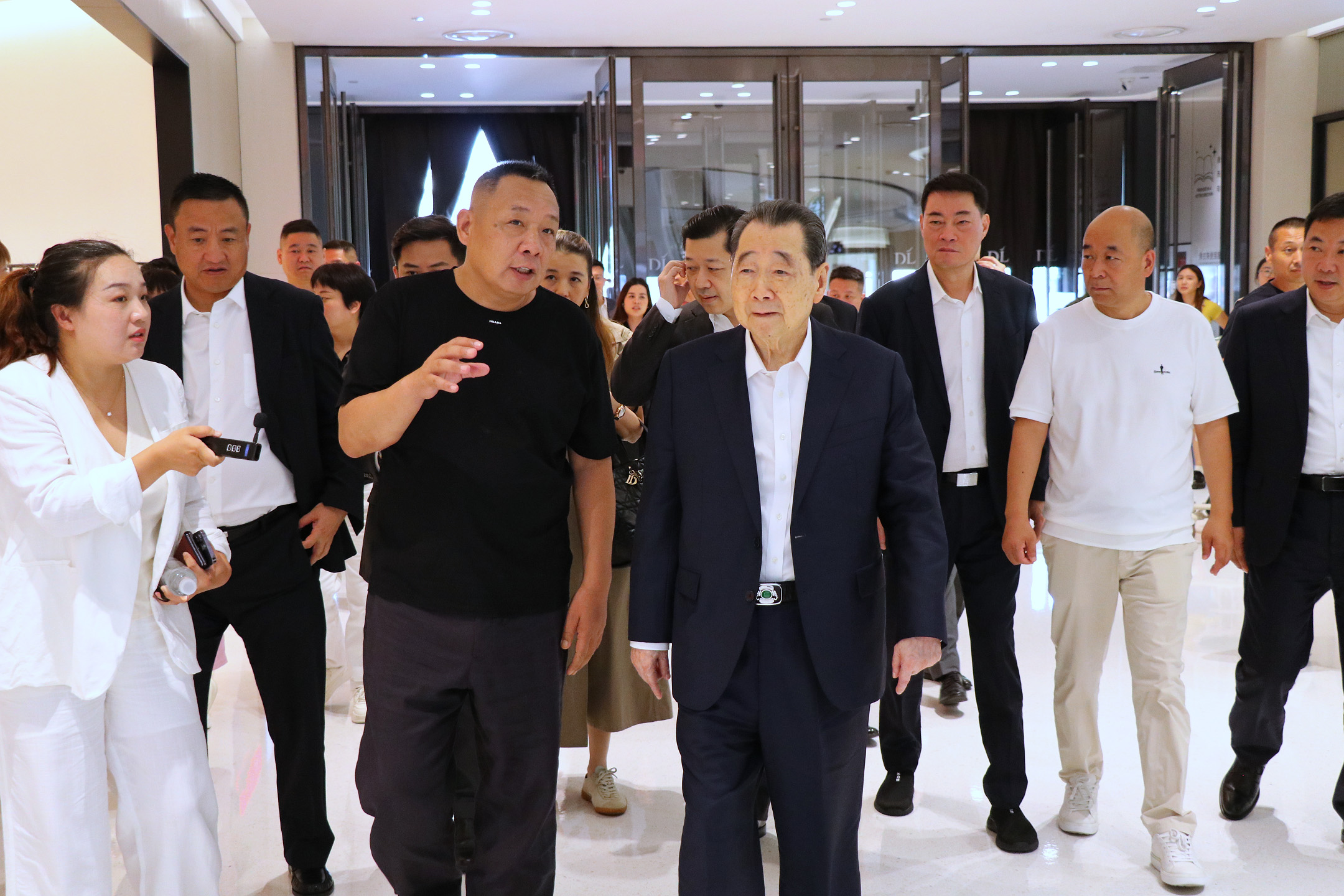 ▲河南胖东来商贸集团董事长于东来(前排左)在位于许昌市的胖东来天使城,热情接待谢国民集团资深董事长(前排右)一行。