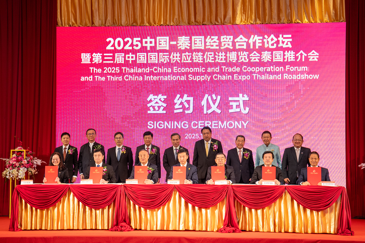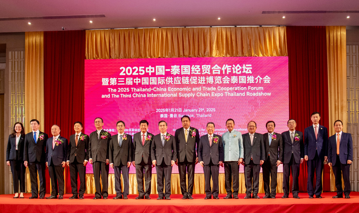 1月21日,由中国贸促会和泰国中华总商会共同主办的中泰经贸合作论坛暨第三届中国国际供应链促进博览会推介会在泰国曼谷成功举行。中国贸促会会长任鸿斌,泰国商业部副部长素察,泰国中华总商会主席林楚钦,中国侨商联合会会长、正大集团资深董事长谢国民,泰国贸易院主席洪百川,泰国投资促进委员会副秘书长纳鲁查,泰中商务委员会主席邱威功,泰国工业联合会主席张学善以及两国商协会和企业代表等300余人出席会议。