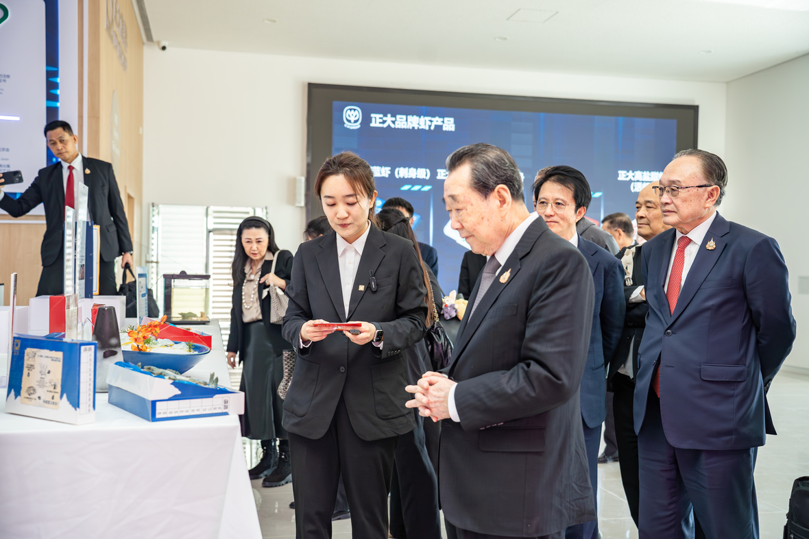 正大集团资深副董事长蔡益光,十三届汕头市政协主席、第二十二届国际潮团总会主席谢泽生,Concordian 国际创始人谢榆,正大集团资深副董事长谢毅,正大集团农牧食品企业中国区资深副董事长王富杰、中国区水产事业副董事长许智明,CPF水产养殖事业COO Sujint Thammasart,蔡益光集团资深副董事长顾问 Vitit Pootanasup,正大集团饲料原料贸易企业中国二区、印度区首席运营官 Thita Tangruthaivanich,CPF水产养殖事业研发负责人 Premsak Wanuchsoontorn,正大集团中国区水产事业财务总监张松荣等陪同考察。