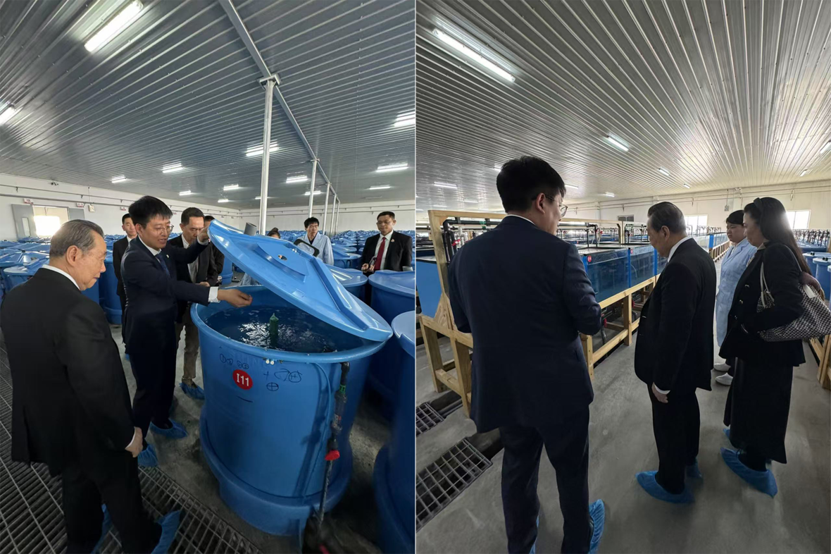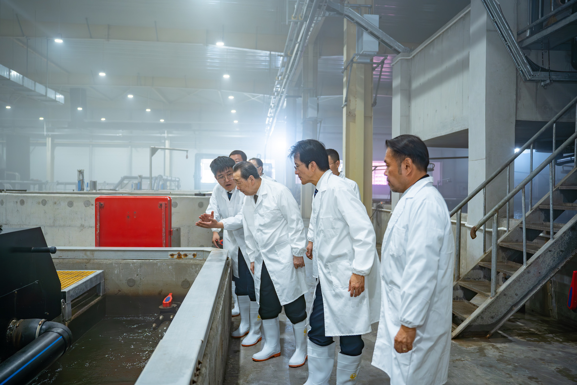 在东营正大水产有限公司循环水养殖项目现场,谢国民集团资深董事长一行视察了循环水养殖系统的运行情况,重点询问养殖品种、养殖规模、水质调控以及销售策略和市场反馈情况等,并进入养殖车间内部,详细查看循环水系统对虾养殖情况和循环水养殖流程。正大研究院动物营养中心虾料营养专家邱璇博士就相关情况进行了详细汇报,谢国民集团资深董事长对进一步优化养殖技术、提高养殖产量和质量给予指示。