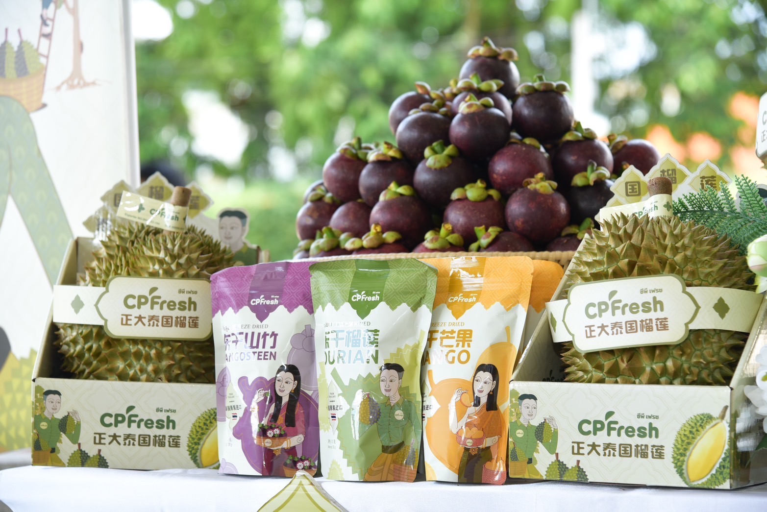 ▲CPFresh正大泰国水果品牌展示多款鲜果及冻干产品,结合原创IP形象传达品牌文化特色。